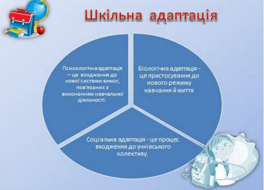 Шкільна адаптація включає в себе біологічну, психологічну і соціальну адаптацію.